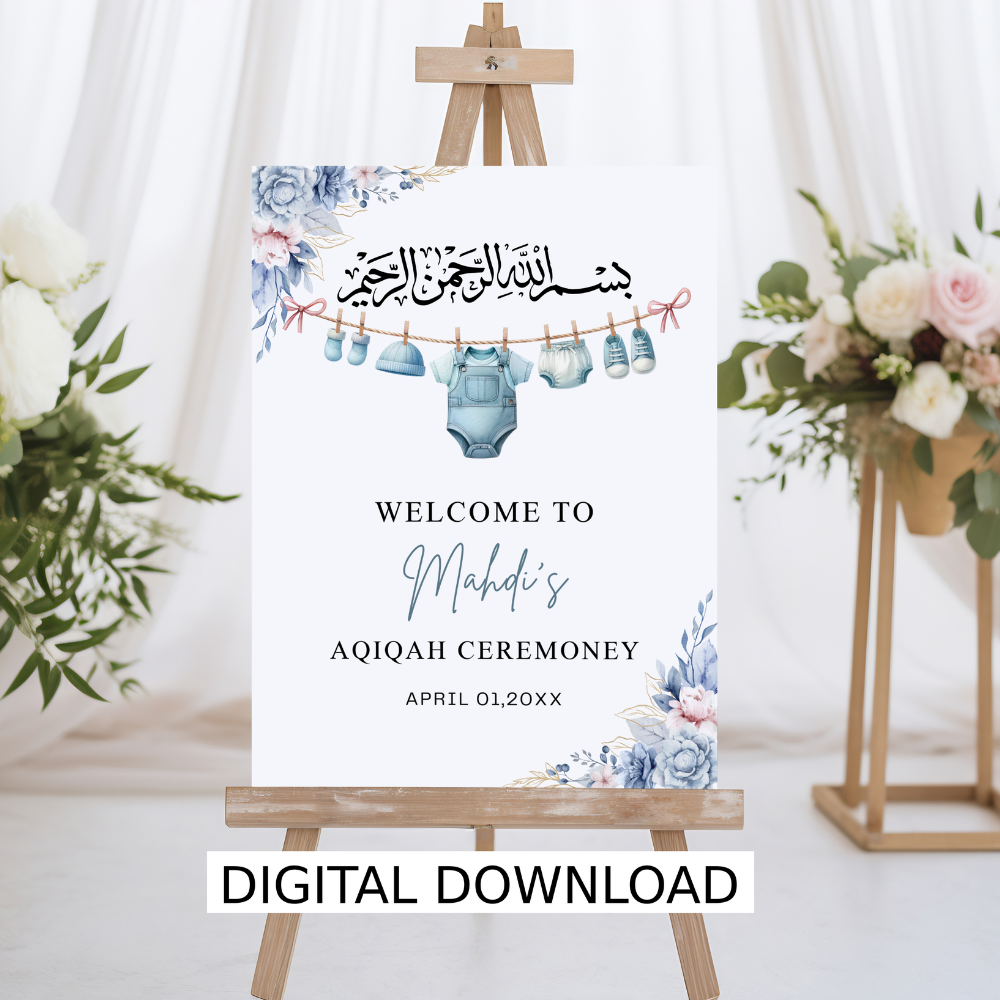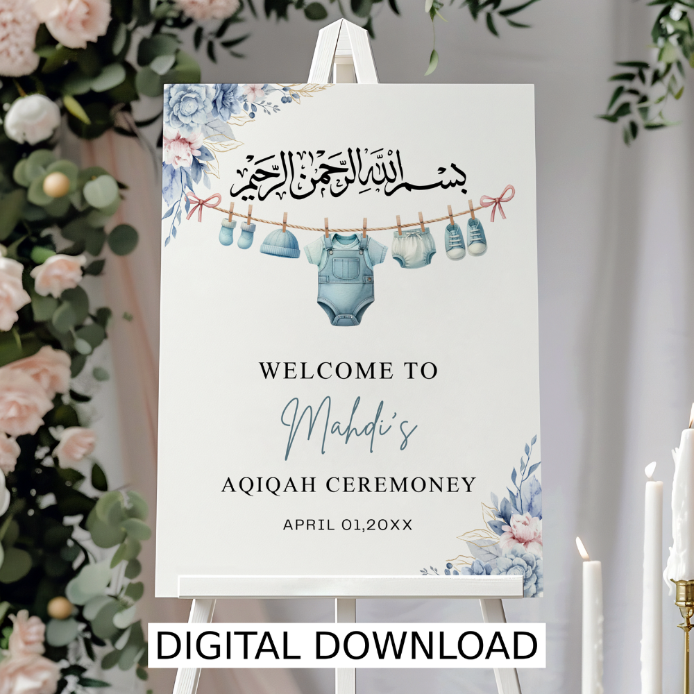 Aqiqah Ceremony Welcome Sign – Personalized Islamic Baby Shower Blue Decor