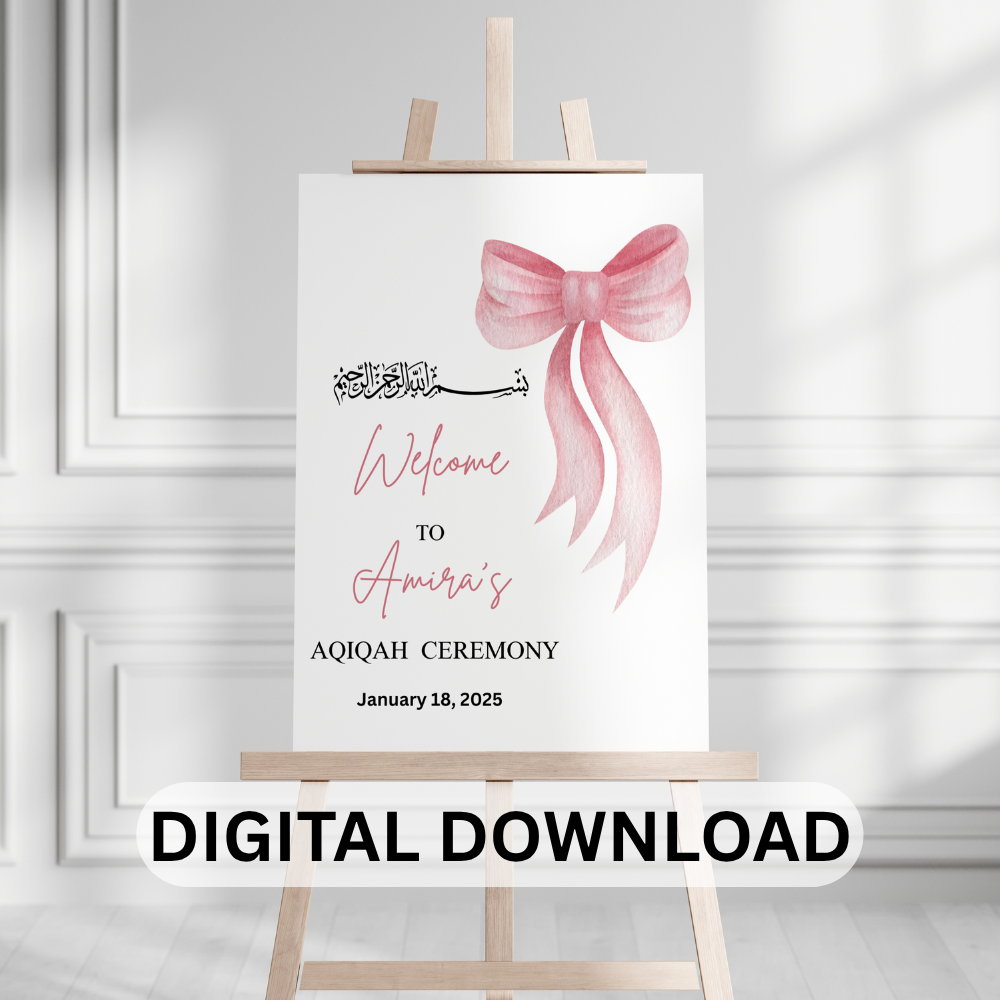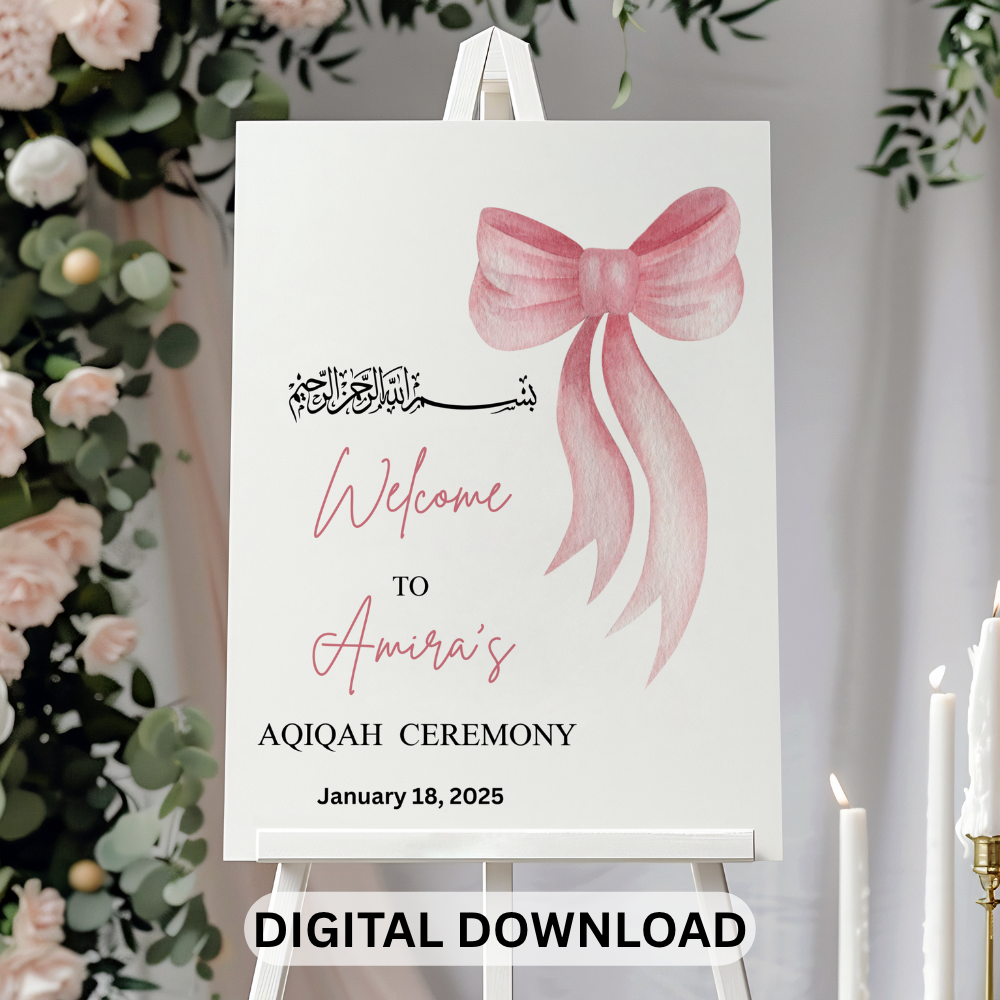 Beautiful printable Aqiqah ceremony welcome sign – personalized digital download to celebrate your baby’s Sunnah Aqeeqah. Elegant Islamic design, perfect for baby boy or girl Aqiqah party decor,