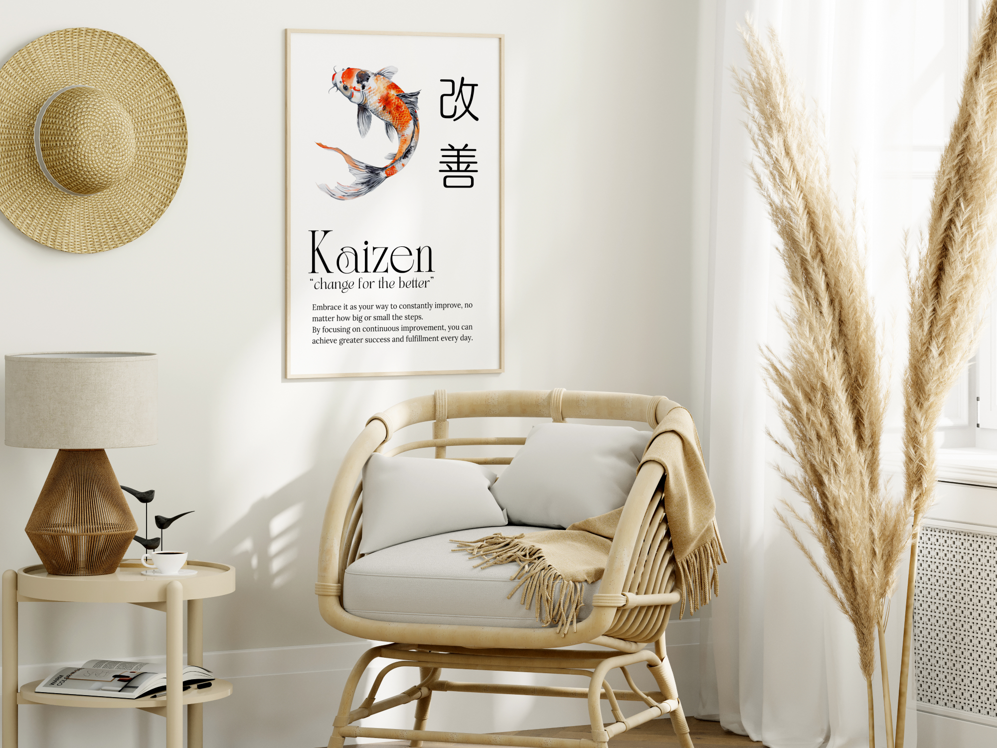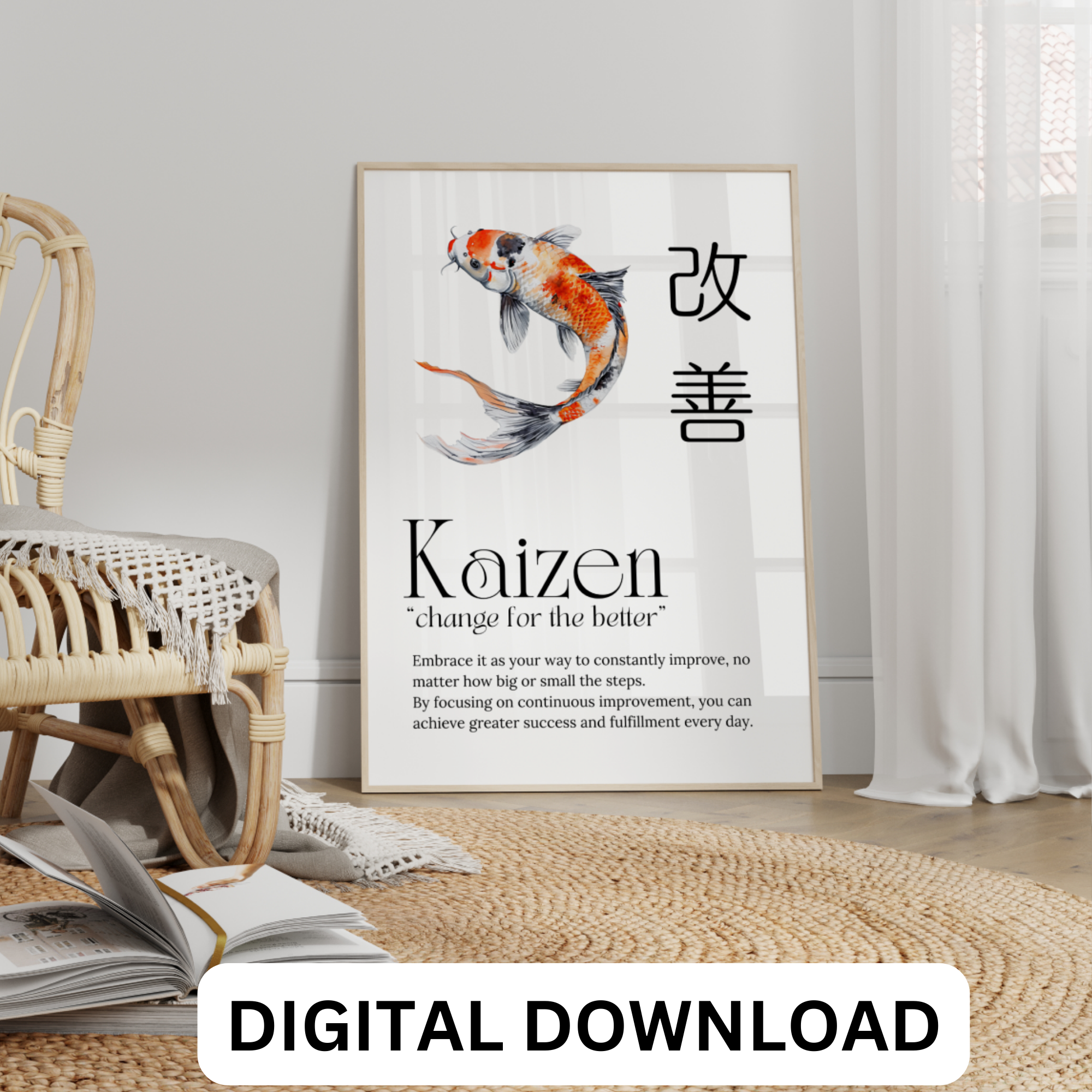 Kaizen – the Japanese art of continuous improvement. Inspired by the graceful koi fish, Kaizen encourages you to make small, incremental changes that lead to remarkable results. Whether it’s boosting productivity, enhancing personal growth, or achieving your goals, Kaizen’s philosophy of ‘change for better’ will guide you every step of the way. Start your journey to excellence today and watch your potential soar!